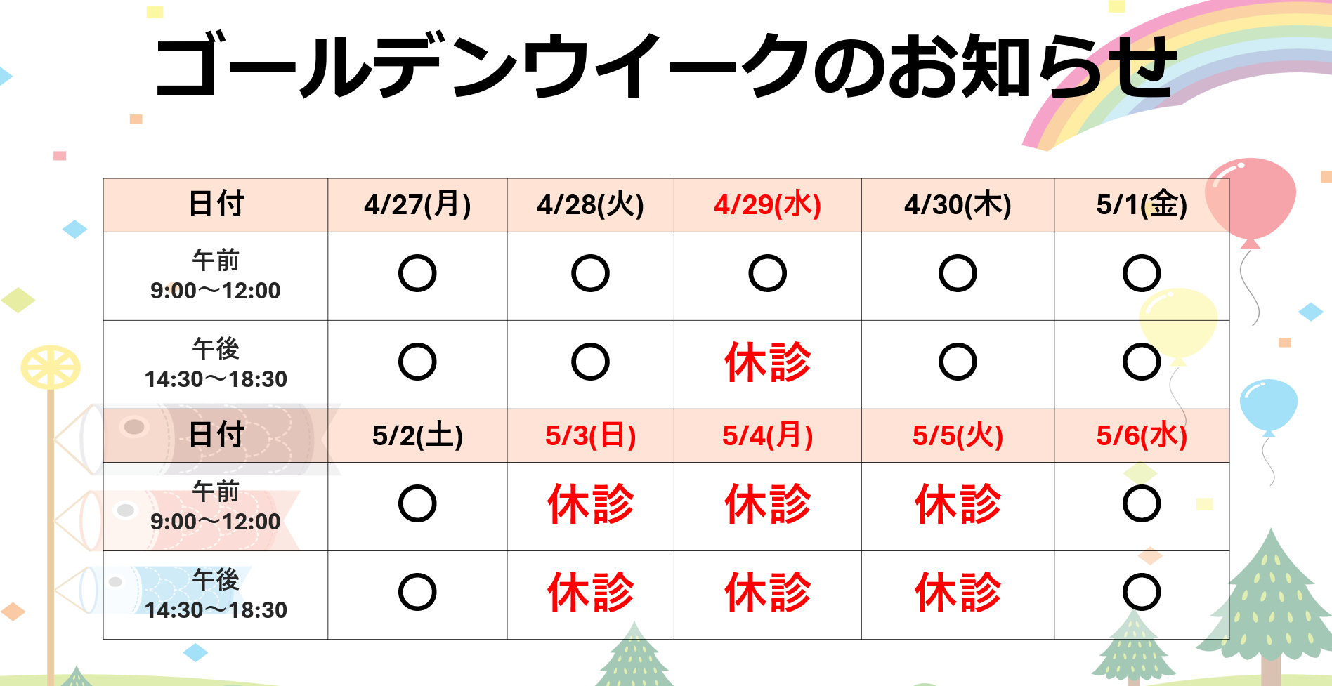 2022/3/28 【お知らせ】ゴールデンウイークの診療について